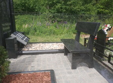 Собираем лавочку, устанавливаем её напротив надгробья. Цветник у подножья мемориальной стелы наполняем светлыми камнями. Под полукруглую арку памятника укрепляем вырезанную из гранита фигуру полумесяца.